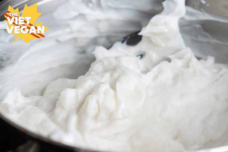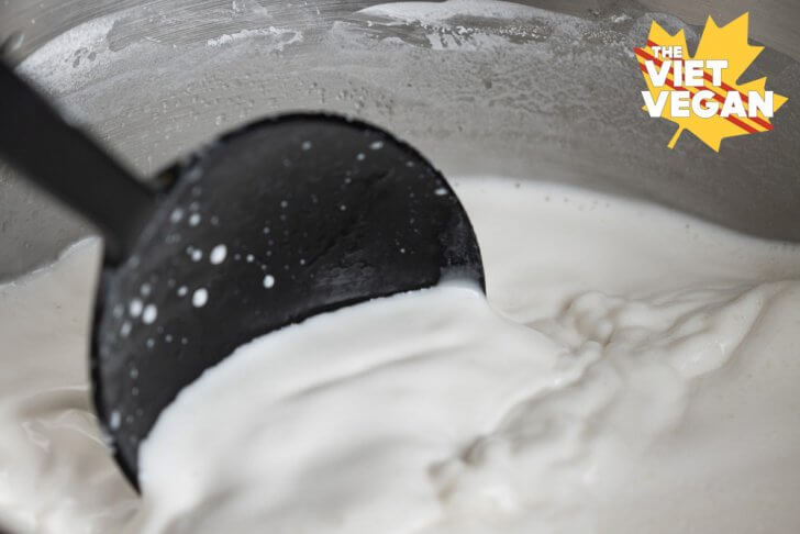 Since testing it in my bột chiên chay YouTube video, I’ve just mixed everything directly into the pot, using a whisk to make sure everything is totally incorporated. Then switching to a silicone spoon, you have to stir it over the heat until it thickens. You want it to be a thick, pancake batter, but not so thick that it’s “glompy”. You want thick and gloopy, but not glompy. Does that make sense..?