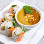 - To serve, add half peanut sauce and half curry sauce into individual dipping bowls. Garnish with crushed peanuts and enjoy with spring rolls!