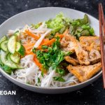 I’m working on veganizing the nem nướng to make these bowls, but I have a version of the “grilled pork” using soy curls. I season that the same way you’d season grilled pork. I served that recipe with bánh hỏi in lettuce wraps, but you can easily swap that as the protein for this vermicelli noodle bowl!