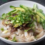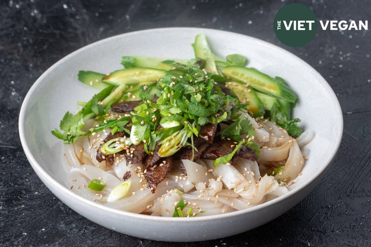 - Top your noodles with 2-3 tbsp of the sauce, sliced cucumber, scallions and sliced seitan. Top with toasted sesame seeds (also I love adding some white pepper on top too). Enjoy!