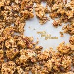 I toyed with different textures of granola: thin and confetti-like vs chunky. Confetti-style granola meant that each ingredient had crisped up with a general sweet flavouring, but they were all individual and frankly difficult to eat out of hand. While my experiment with granola wasn’t exactly what I wanted, it was still pretty delicious. I learned that I much prefer clumps of crunchy granola, with some oats, some sort of nuts or seeds, and a sweet, crisp binder that just marries it all together. I recently discovered that I am in fact, not allergic to peaches, so I went a little peach crazy. I pureed a handful of peaches, tossed some cinnamon, ginger, and sugar into a pot to melt down and pour over oats, pepitas, and pecans.