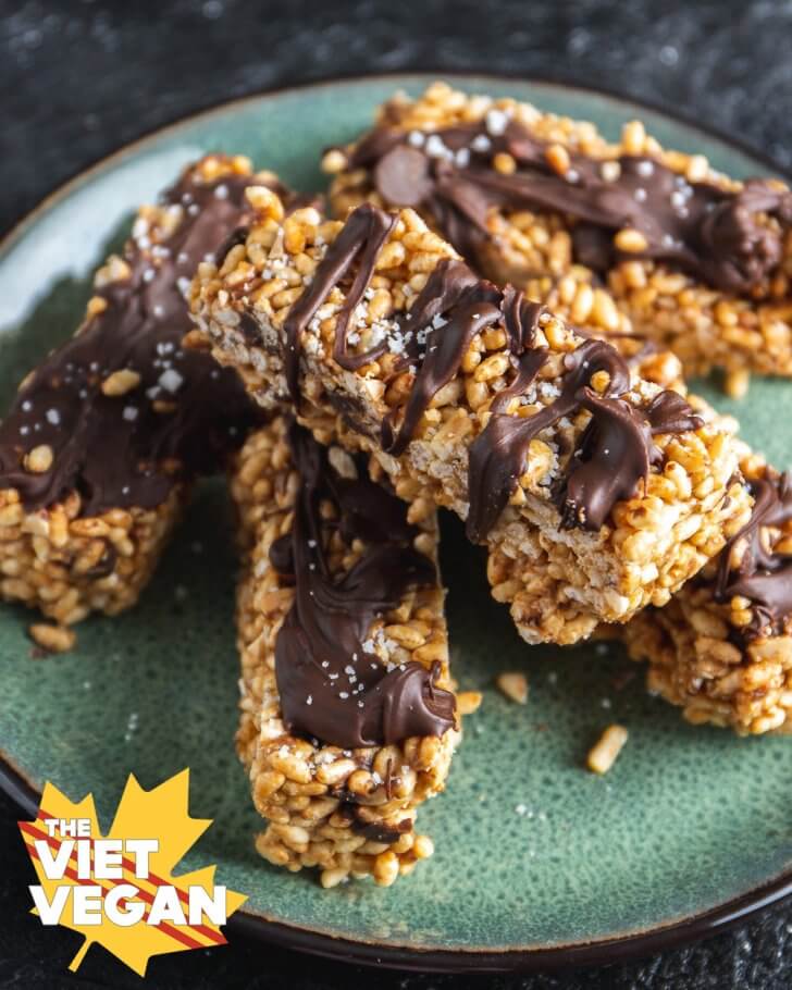 Lastly I tried this super nostalgic Chocolate Peanut Butter Rice Bars. I struggled quite a bit with the execution, but mostly because I apparently can’t read and I had to substitute brown rice syrup for the agave nectar, but in the end, I got these incredibly crunchy and satisfying snacks. I snacked on these all week and it really hit the spot with that PB and chocolate combo. The touch of salt is super delicious, and the addition of peanuts and peanut butter with the higher fibre count of the brown rice puffed cereal added to the satiety a lot.