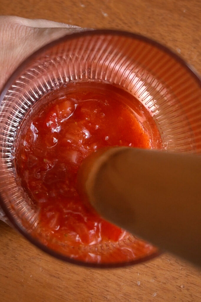 I’m using a high quality ceremonial grade matcha, but use whatever unsweetened matcha powder you enjoy the taste of. Sweeten to your liking, but I macerated strawberries (helped with some aggressive mashing because I don’t have time to wait) to add a subtle sweetness.