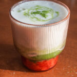 - Add prepared matcha on top, and serve with a wide straw to enjoy the smashed strawberries