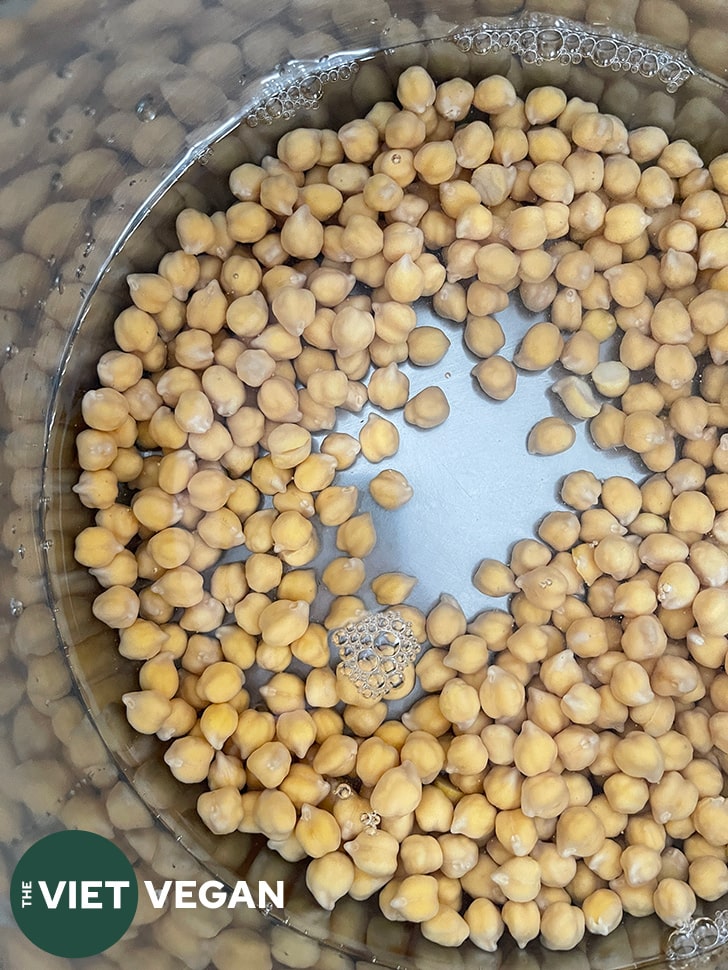 - Soak the chickpeas with 1 tbsp salt and water to cover the beans with 1-2 inches of water. I usually soak for about 20 hours, but at least 8 hours helps reduce gassiness.