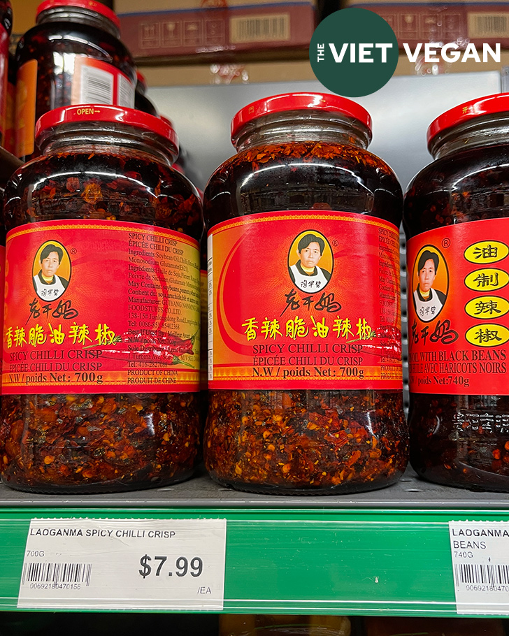 There are some versions of spicy chili crisp that have animal products in them, so just get the spicy chili crisp! Double check that label. There are ones with peanuts, ones with black beans, etc. The jar above is the one I buy.