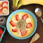 - Blend coconut water, frozen mango and pineapple chunks and rolled oats until smooth. Add maple syrup if you like it a bit sweeter. Pour into a bowl and garnish with hemp and sunflower seeds for protein, flax meal for extra fibre, and cacao nibs for iron, fibre, and crunch! Fresh fruit adds more sweetness and texture. Enjoy immediately =)