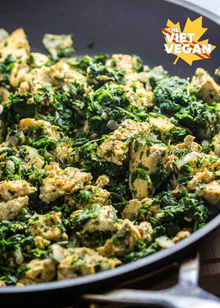 - Add in torn tofu ("torn chicken") and toss to coat in onion and garlic goodness. Sprinkle poultry seasoning on top (and garlic powder if you didn't have fresh garlic on hand). Cook until tofu starts to brown, then add cooked spinach and stir to combine.