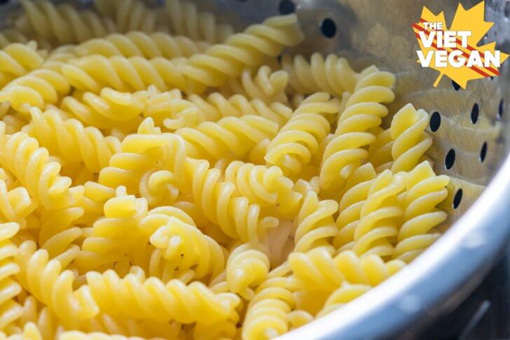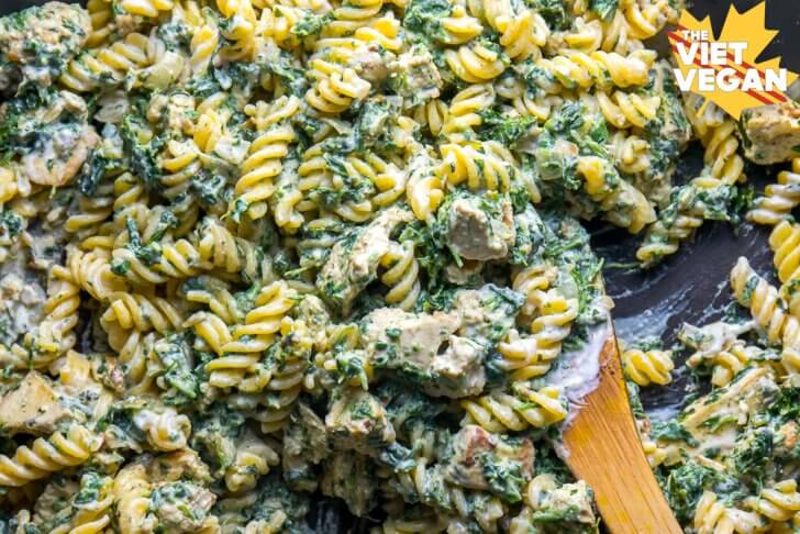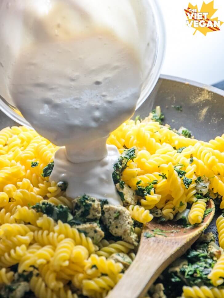 - Add both cooked pasta and this creamy sauce to the tofu chicken pan and stir to coat. Adjust with a splash of soy milk if you find it still a little thick.