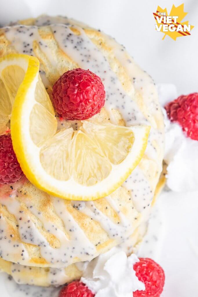 - Stack your pancakes, drizzle the syrup or the glaze over the pancakes and add vegan whipped cream and raspberries! Add a slice of lemon for garnish if desired.