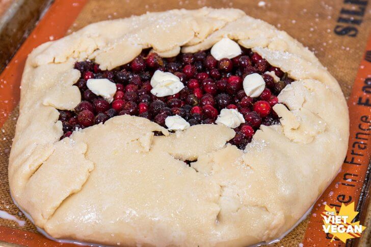 - Roll out your dough into a round-ish shape to about 1/4 inch thickness. Add the berry mixture into the centre and add 1 tsp dots of vegan butter across the berry mixture. This will melt and become part of the sauce.