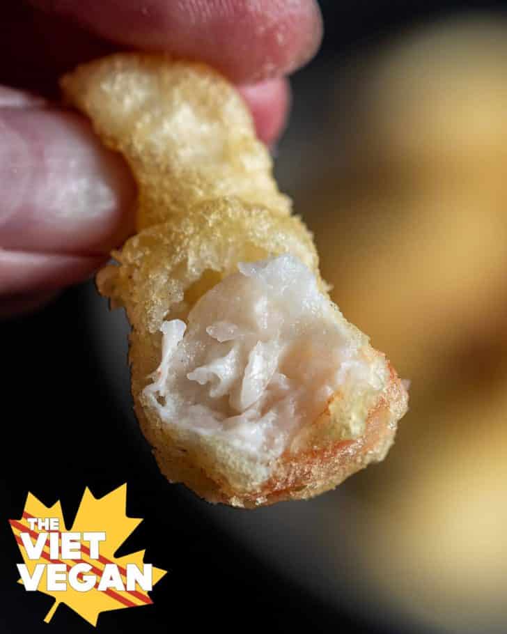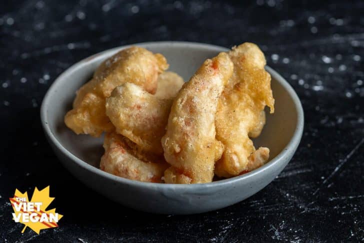 - Batter your vegan shrimp/sliced veggies (like eggplant, mushroom, broccoli, sweet potato slices, potato slices, green beans MM so many possibilities), then fry until they are crispy! They won't get super golden, but make sure you turn them so they fry evenly. Remove from oil and let drain on a paper towel.