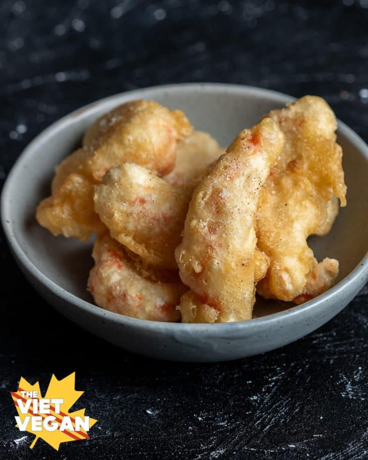 I use this batter for vegan shrimp, eggplant, mushrooms, broccoli, it’s all worked out deliciously and so long as you heat up the oil to the proper temperature, the batter will crisp up and cook quickly and avoid absorbing too much oil. If you have any veg that struggles to cling to the batter, make sure you dry your vegetables well and/or toss in a bit of cornstarch to help the batter stick a bit better.