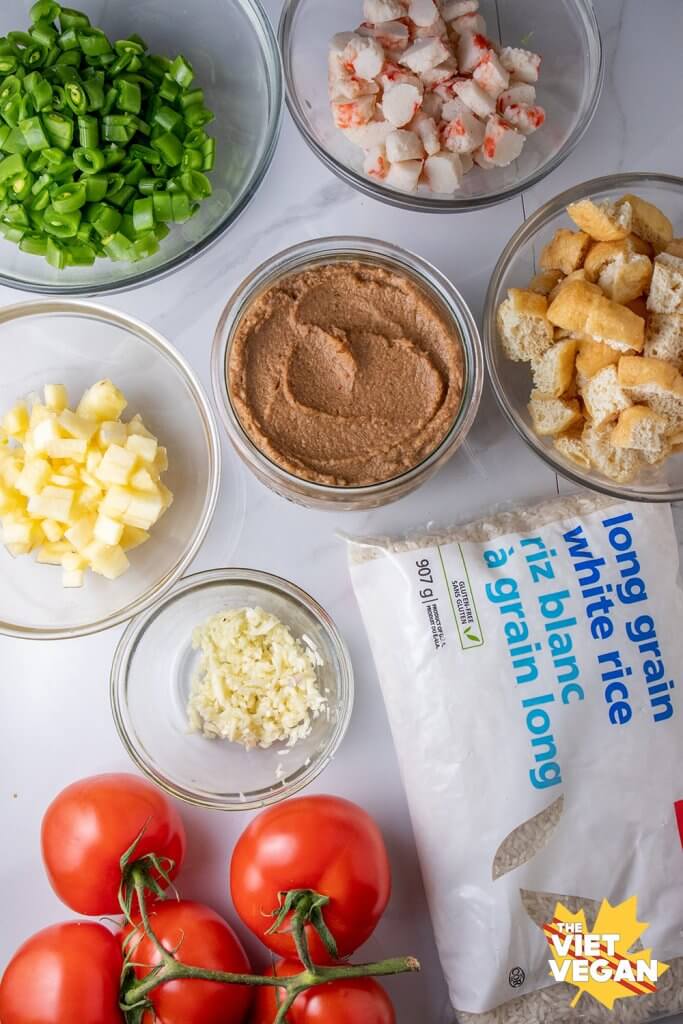 One of my favourite dishes at our local veg-friendly Chinese restaurant is a vegan tom yum fried rice with tons of fresh pineapple, soy ham, tomato, and lemongrass-y goodness. I’ve been procrastinating veganizing it to enjoy at home but thanks to USA Rice, you guys have it sooner than later!
