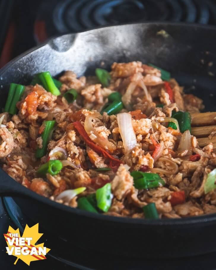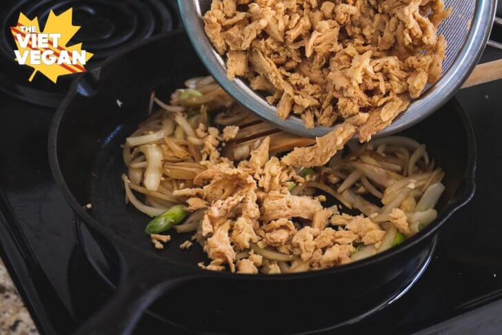 You have to soak the soy curls in a bit of mushroom broth powder with the water (but vegetable broth would work too), to impart a bit of extra flavour and mask that classic funky TVP flavour. Soy curls tend to have a magical, torn texture that few other TVP products have, but you could easily do this with TVP chunks as well. This dish is typically made with sliced beef, but seeing as I’m vegan, these rehydrated soy curls are an easy and tasty alternative.