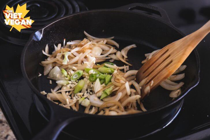 - In a large pan, preheat over medium heat, then cook sliced onion in sunflower oil until lightly browned. Add minced garlic and finely chopped whites of green onion. Stir to cook until fragrant (about 1 minute).