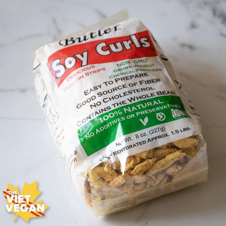 - Strain soy curls of their liquid and squeeze to get rid of as much liquid as you can. Add rehydrated soy curls to the pan. Add 2 tbsp soy sauce and stir to coat and combine.