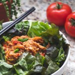 You may think having soy curls simmered with tomato wedges over a bed of torn red leaf lettuce is an odd combination, but it is a really refreshing and satisfying dinner. The crunch of the lettuce leaves melts into the savoury stir fry; enough flavourful bite to satisfy but light enough that it wouldn’t weigh you down. Onions, garlic, a bit of soy sauce and mushroom broth powder give this dish the light seasoning it needs to bring out the tomato goodness.