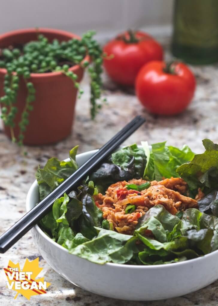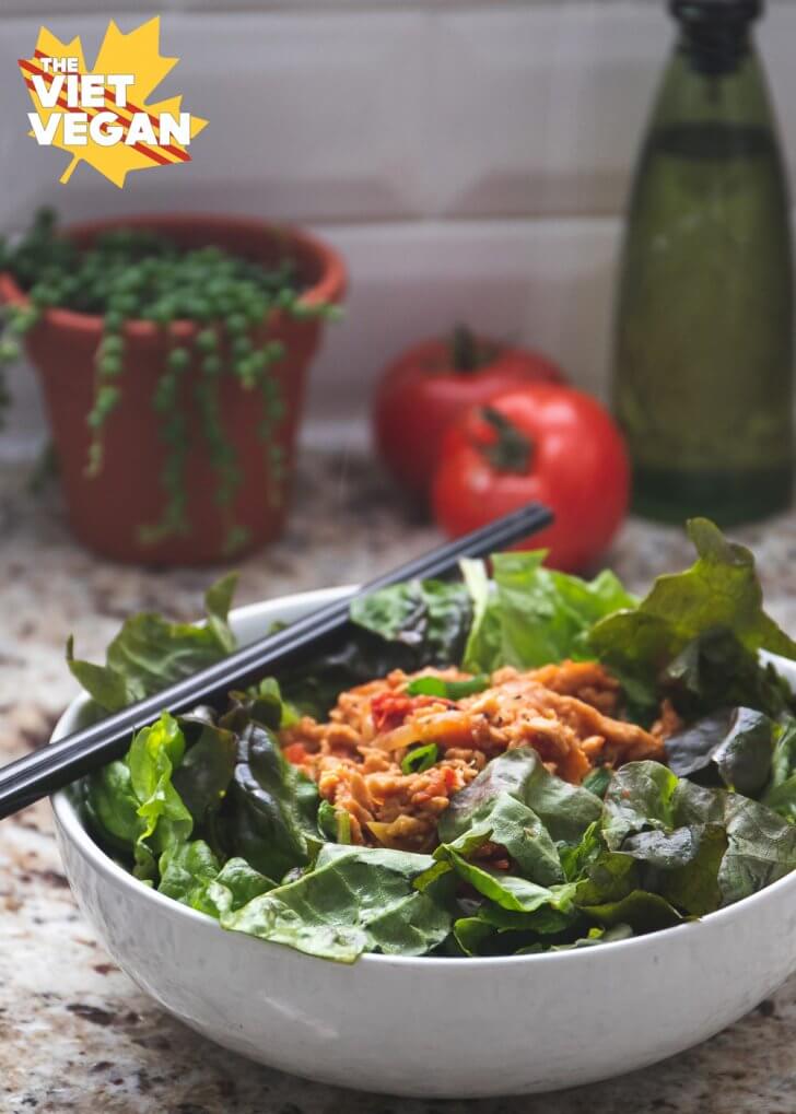 Fast forward 15 years later, I called my mom asking her for Vietnamese tomato-based dishes I hadn’t already made before. She described this salad but didn’t know the Vietnamese name (honestly I still don’t really either), but we landed on on Salad trộn cà chua, which roughly translates to tomato stirred salad. What it really is, is a tomato and soy curl stir fry over some lettuce leaves, but we haven’t quite figured out the proper name for this dish, so stir fry salad it is. Before I even made the dish I was already transported back to my angsty teen years and the murder mystery shows, laughing at how stubborn mystery writer & amateur detective, Jessica Fletcher, was at pursuing justice.
