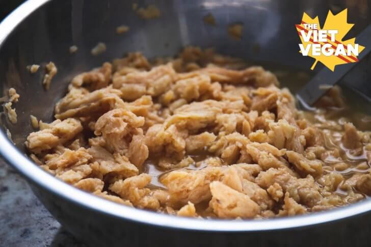 - Combine soy curls, mushroom broth powder, and boiled water in a large bowl to let the soy curls rehydrate for about 10 minutes while you prepare the rest of the ingredients.