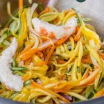 - In a large bowl, combine julienned green mango, cucumber (I prefer to remove the seeds because otherwise its too wet), carrot, red onion, and halved vegan shrimp.